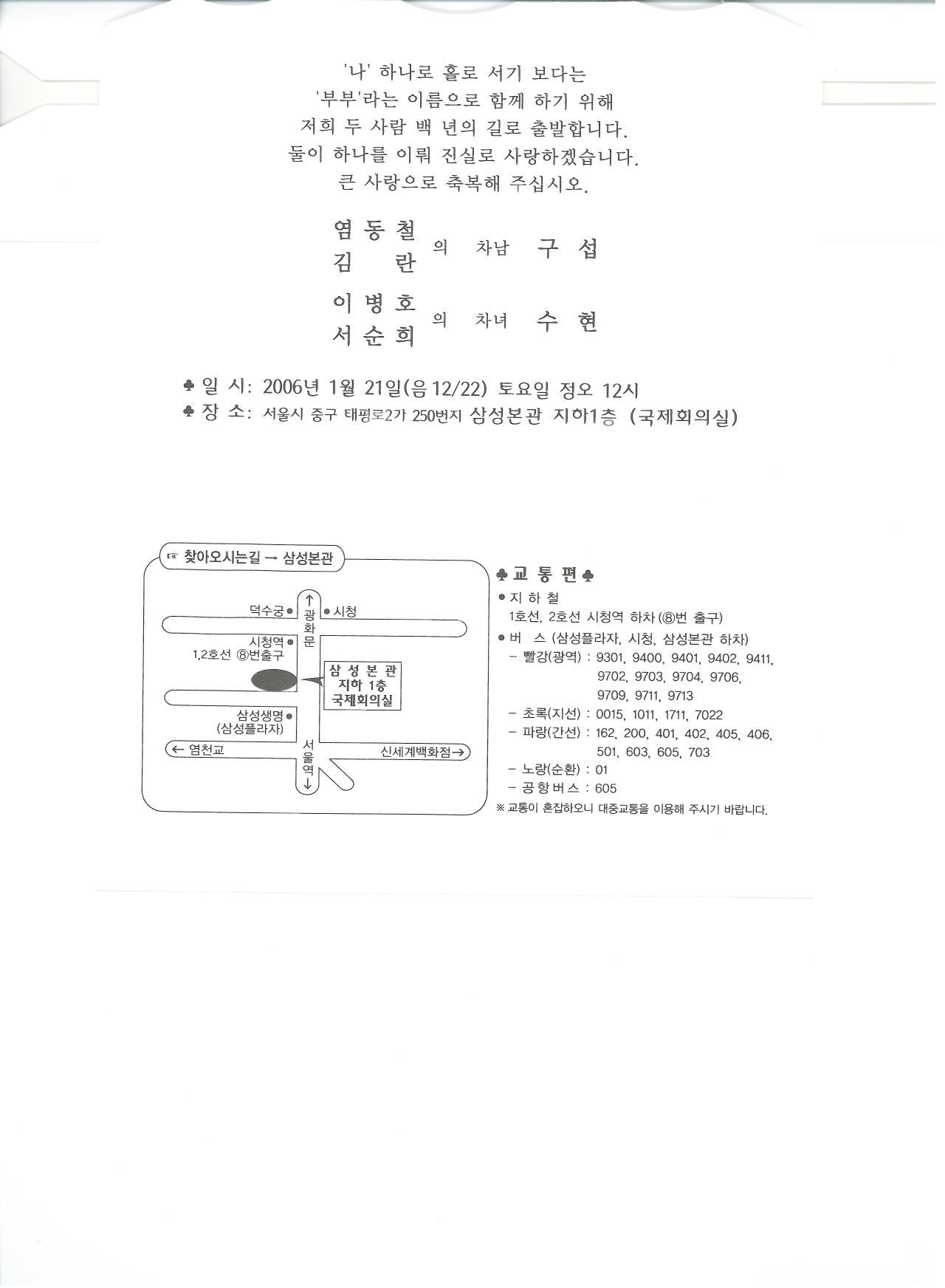 ¼º±Õ°ü ´ëÇб³ »ê¾ÇºÎ 14±â ¿°µ¿Ã¶ ȸ¿ø Â÷³²ÀÇ °áÈ¥½ÄÀÌ 1¿ù22ÀÏ Åä¿äÀÏ Á¤¿À 12½Ã¿¡ ÅÂÆò·Î »ï¼ºº»°ü ÁöÇÏ 1Ãþ ±¹Á¦È¸Àǽǿ¡¼ °ÅÇà µÇ¿À´Ï ȸ¿øºÐµéÀÇ ¸¹Àº Âü¼®À» ¹Ù¶ø´Ï´Ù. (¼¼ºÎ»çÇ× ÃÊ´ëÀå ÂüÁ¶)